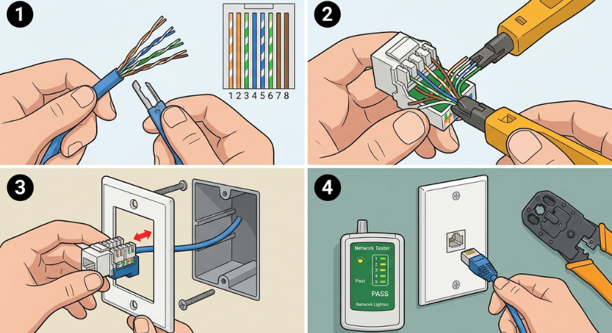 Khi bấm dây vào nhân mạng (module jack) trên tường, hãy tuân thủ đúng chuẩn B (T568B). Đây là chuẩn phổ biến nhất tại Việt Nam, giúp đồng bộ hóa toàn bộ hệ thống.