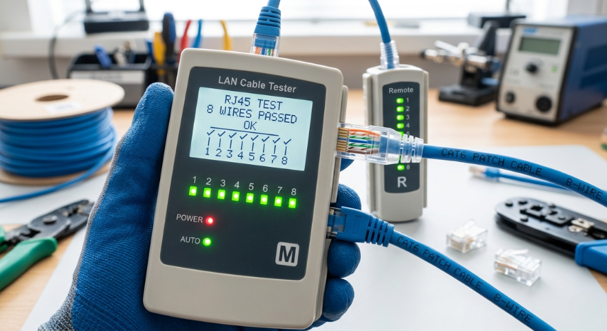 Sau khi lắp xong, dùng máy test mạng để kiểm tra thông mạch. Đảm bảo cả 8 lõi dây đều nhận tín hiệu trước khi tiến hành trát tường hoặc ốp gạch.