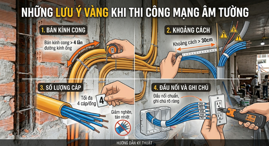 Việc đầu tư thời gian và công sức để tối ưu: cách đi dây mạng âm tường ngay từ đầu. Sẽ giúp bạn sở hữu một không gian sống hiện đại. Tiện nghi và không bao giờ phải lo lắng về vấn đề “mạng yếu”. Hy vọng những chia sẻ trên sẽ giúp ích cho công trình của bạn!